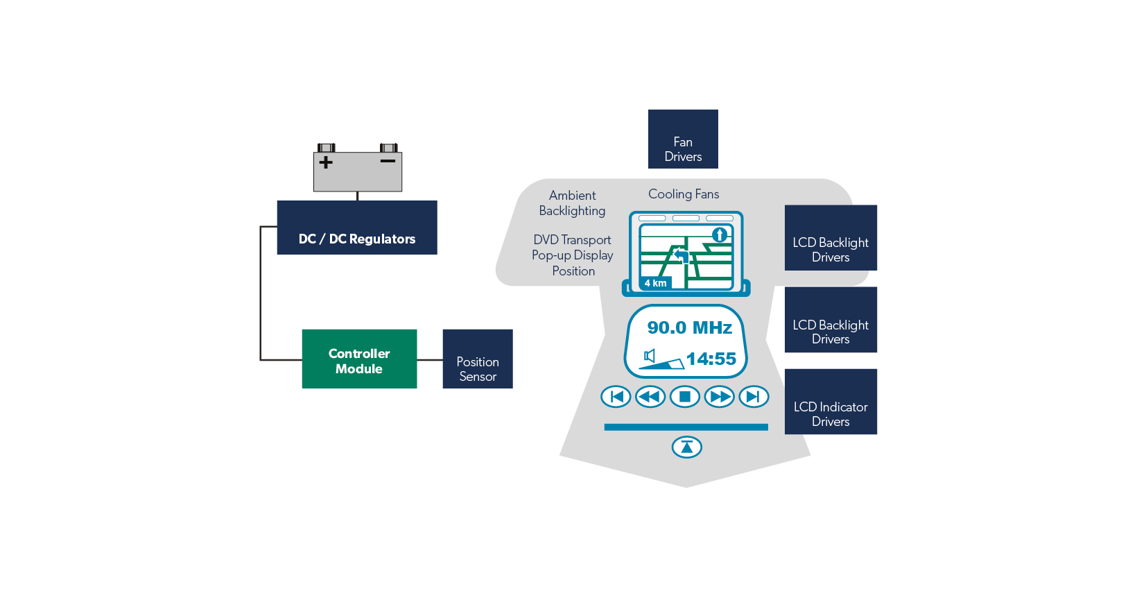 Electronic content in cars keeps growing. Our comprehensive offering of switching regulators, LCD bias supplies, LED backlight drivers, and motor driver ICs is perfect for your driver information systems, navigation, and other infotainment applications.