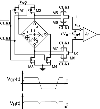 Fig. 4 shows the actual switched-plate arrangement used in the monolithic sensor IC where the four single-pole double-throw (SPDT) switches required for the contact permutation were implemented with MOS transistors. The plate contact interconnections follow the basic scheme of Fig. 2 except for an interchange of the output terminals during the 90° state. With this arrangement, at each change of state, VH changes polarity and Vop remains quasi-constant, in such a way that VoA, the DC input-referred offset of amplifier A1, will become indistinguishable from Vop, and the Hall plate and the input amplifier offsets will be simultaneously processed and cancelled by the signal conditioner.