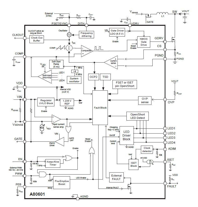 - Four integrated LED current sinks, up to 210 mA each