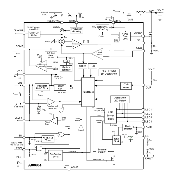 - Programmable boost frequency dithering to reduce EMI