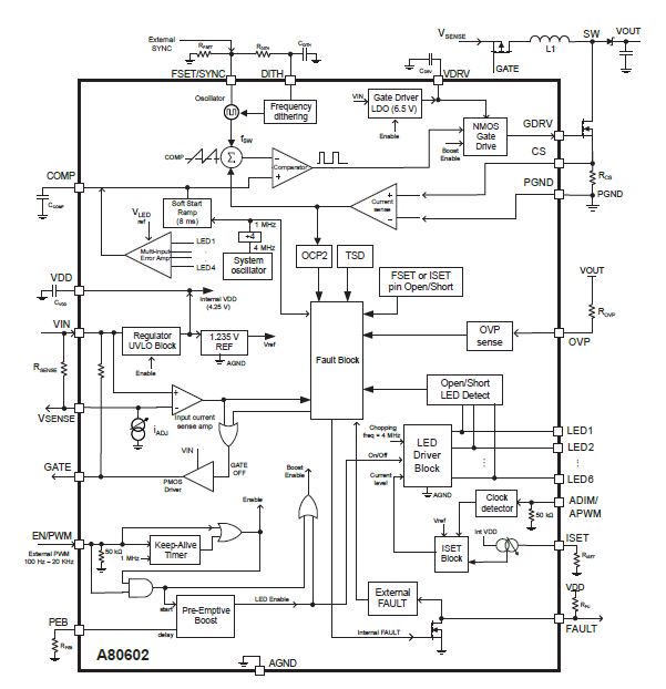 - Six integrated LED current sinks, up to 140 mA each
