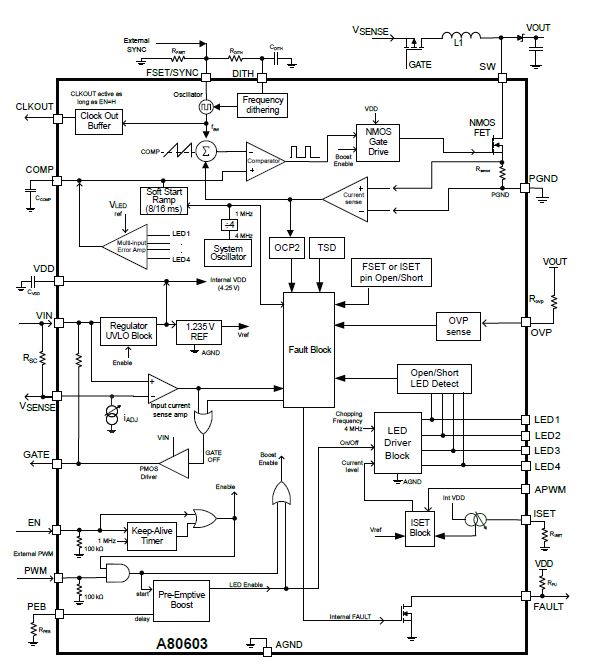 - Fully integrated LED current sinks and boost converter with internal power MOSFET