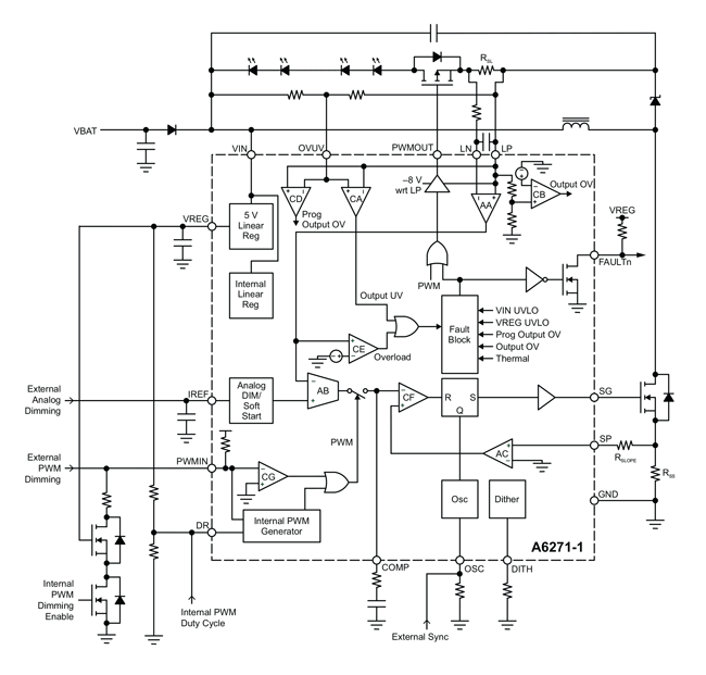 - Dimming via external PWM, internal PWM and/or analog dimming