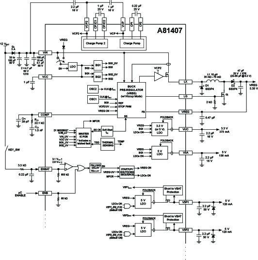 - 2.2 MHz buck or buck/boost pre-regulator (VREG: 5.35 V) with low EMI frequency dithering