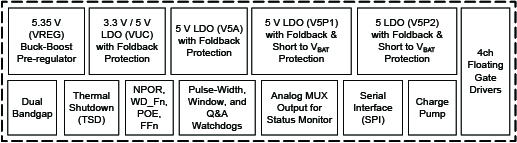 Multi-Output Regulator with Buck or Buck-Boost Pre-Regulator, 4× LDO Outputs, Watchdog, 4× Gate Drivers, and SPI
