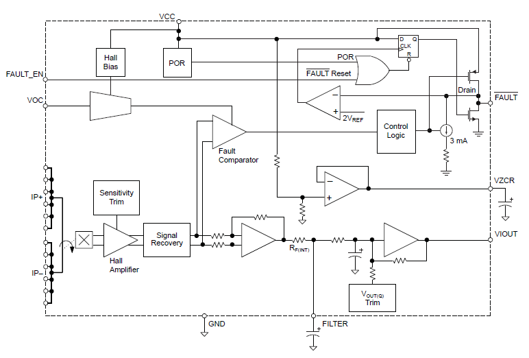 - Integrated shield greatly reduces capacitive coupling from current conductor to die due to high dV/dt, and prevents offset drift in high-side applications