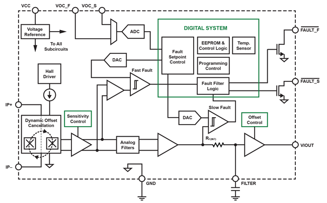 - Integrated shield virtually eliminates capacitive coupling from current conductor to die due to high dV/dt voltage transients