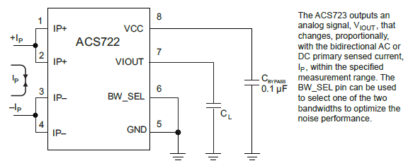 - ACS723LLC: Small footprint, low-profile SOIC8 package suitable for space-constrained applications