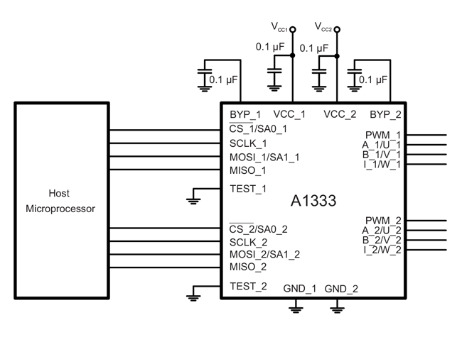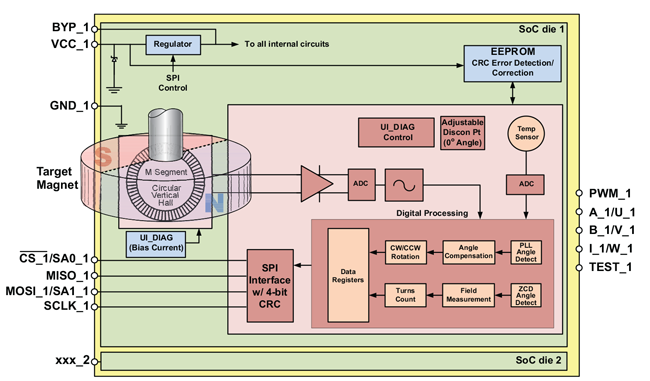 - 10 MHz SPI for low latency angle and diagnostic information; enables multiple independent ICs to be connected to the same bus