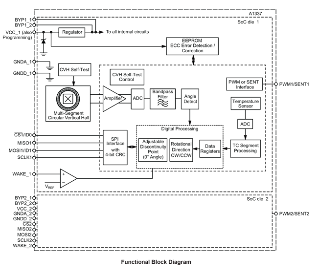 - EEPROM with Error Correction Control (ECC) configuration, sensor calibration including end-of line adjustments like programmable angle reference (0°) position and rotation direction (CW or CCW)