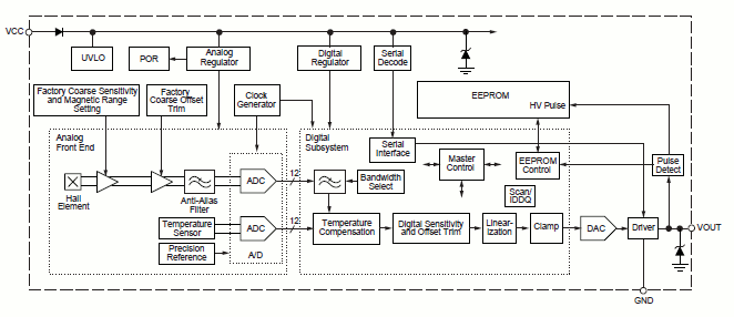 - Factory trimmed magnetic input range (coarse sensitivity) and signal offset