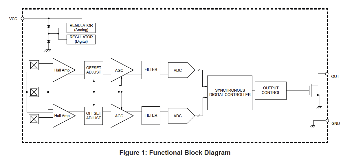 • Three-wire output pulse-width protocol supporting speed, direction, and safe state