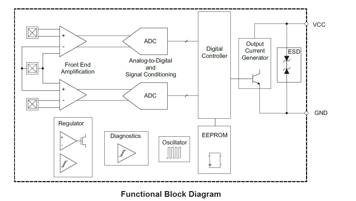 - Two-wire current source output pulse-width protocol supporting speed, direction, and ASIL error reporting