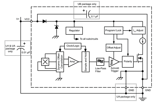 - UB package with integrated 0.1 μF bypass capacitor