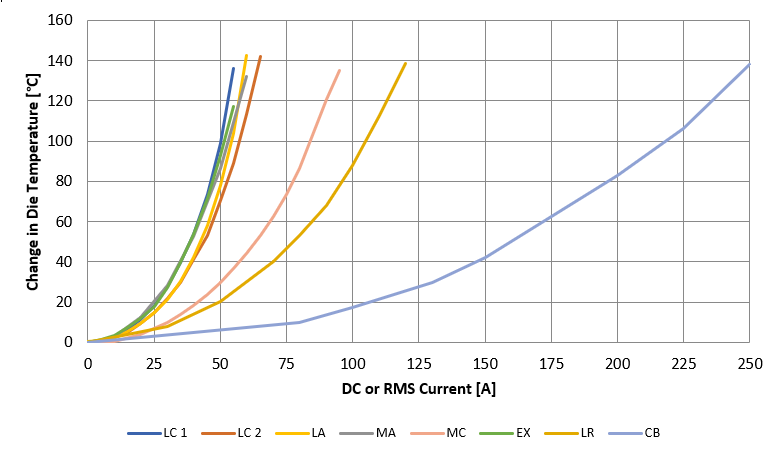 This package is a unique solution for high-density PCB design that allows customers to shrink their overall size with a simple, easy-to-use current sensor compared to other expensive, bulkier, and more complicated solutions such as shunts or larger modules. More details about the thermal performance can be found in this app note. Other alternative high current density packages include Allegro’s tiny (6.4 × 6.4 mm2) custom LR package, which can handle up to 500 V DC working voltage and 100 A+ current. A third offering is the new custom SOIC16W (MC) package that has a thick leadframe that allow this package to pass 80 A+ while offering excellent 1600 V basic isolation voltage. Figure 3 highlights the different packages temperature rise as various continuous current levels.