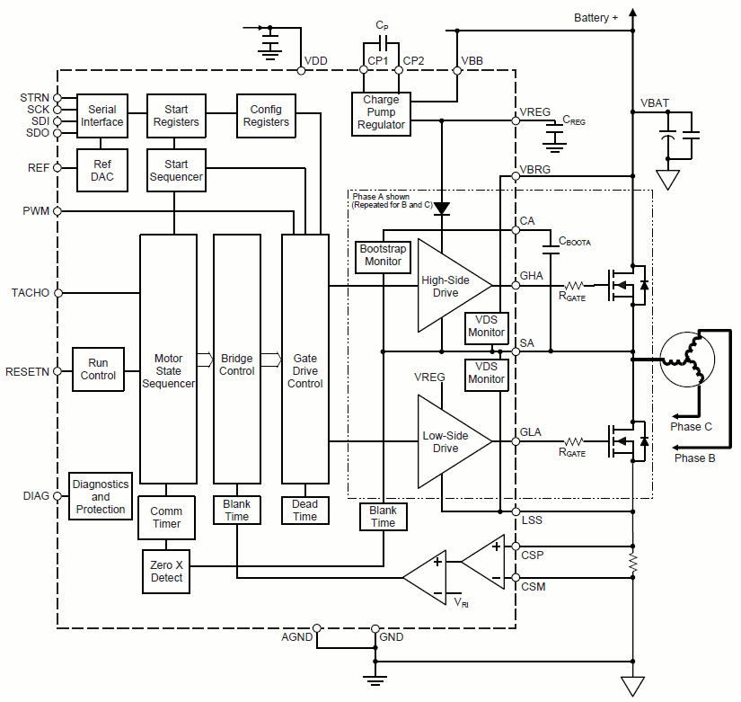 • 3 相 BLDC センサーレス起動およびコミュテーション