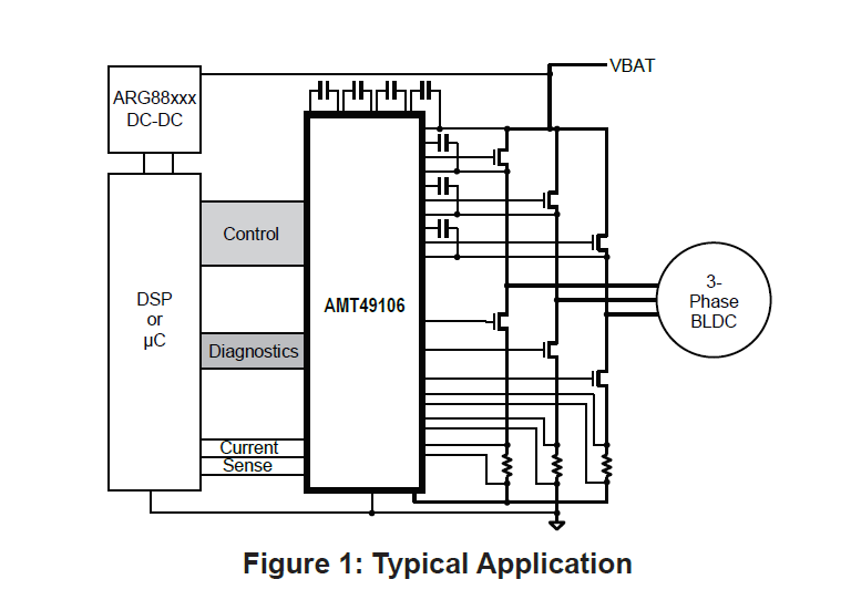 • The AMT49106 includes three current sense amplifiers for highly accurate and redundant current sensing