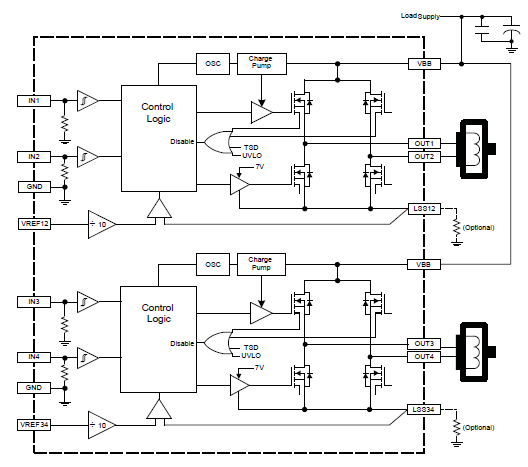 A4954: デュアル フル ブリッジ DMOS PWM モータ ドライバ