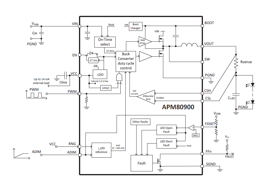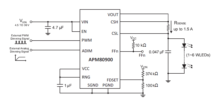 - Dimming via external PMW or EN Pin - Programmable internal PWM dinning (APM80904) - Analog dimming for brightness calibration and thermal foldback