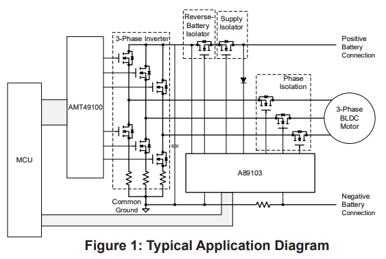 The A89103 provides three independent gate drives that can disconnect a motor from its drive circuitry to allow secondary system to take over control. The device includes additional drivers for battery disconnect and reverse battery isolation.