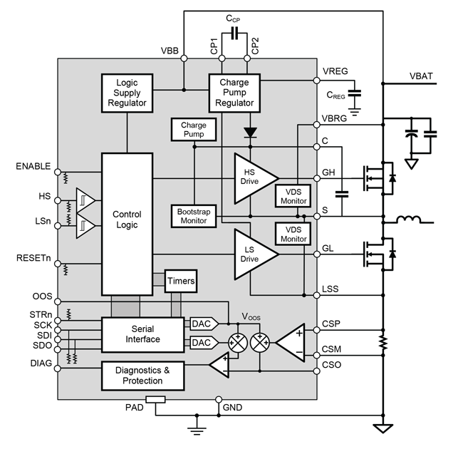 • 用于 N 通道 MOSFET 桥的自举栅极驱动