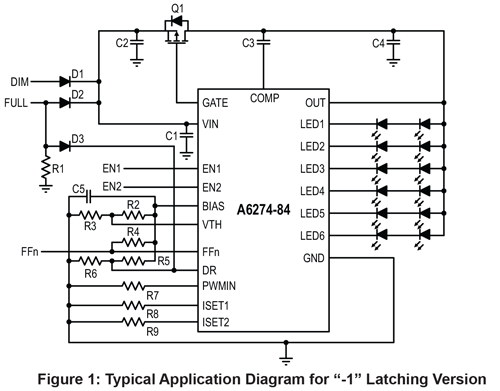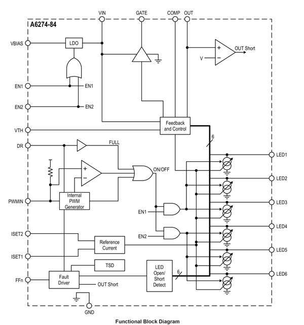 - 6 个 LED 灌电流最大额定值可达 60 mA (A6274) 或 120 mA (A6284)