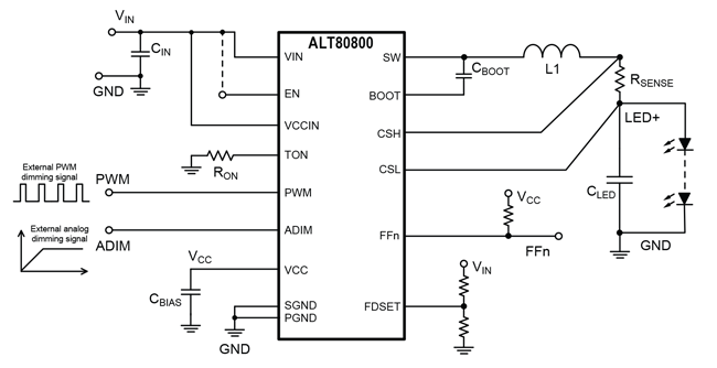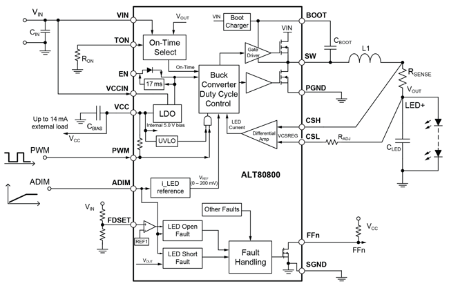 - 55Vin rating (60V abs max) – Can be used on traditional 12-V automotive, and 24-V trucks, and systems using a pre-boost supply followed by the ALT80800 to drive a high number of LEDs