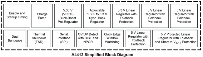 - 带折返过流短路保护的四个内部线性稳压器,3.3 V (3V3) 和三个 5 V(V5CAN、V5A 和 V5B)