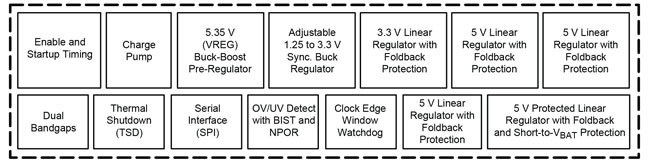 - Four internal linear regulators with foldback short-circuit protection, 3.3 V (3V3) and three 5 V (V5CAN, V5A, and V5B)