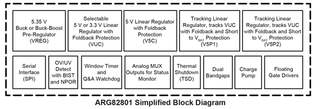- V5P1 和 V5P2:两个 LDO 稳压器(跟踪 VUC 电压),并配有用于远程传感器的电池短路保护