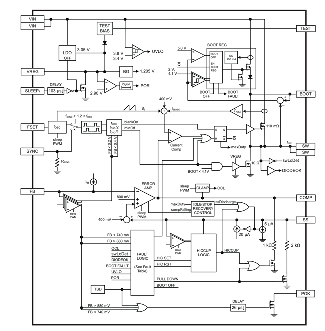 • External compensation provides flexibility to tune the system for maximum stability or fast transient response