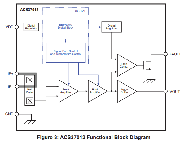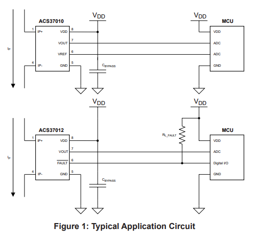 - Fast logic alert fault output pin with factory pre-programmed trip point provides overcurrent or short-circuit detection and enhanced system protection (ACS37012)