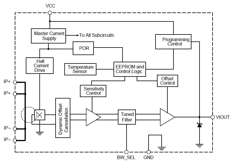 - ACS722LLC:集成屏蔽实际上消除了从电流导体至晶片的电容耦合,显著抑制了高 dv/dt 瞬变导致的输出噪声