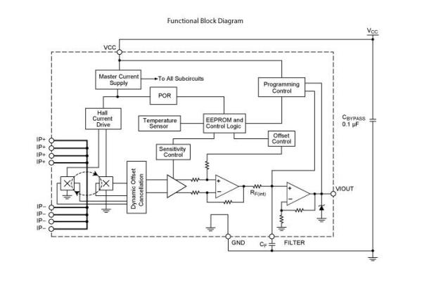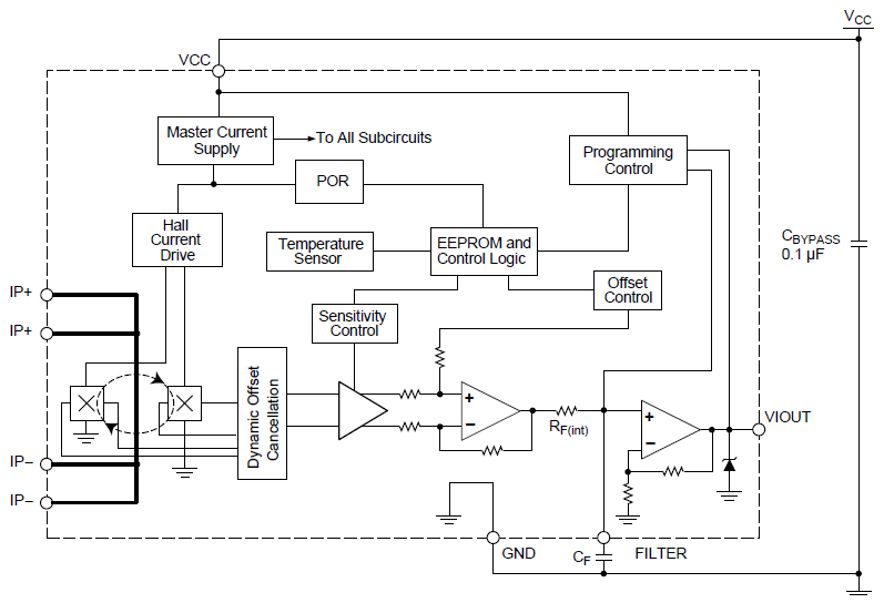 • Integrated shield virtually eliminates capacitive coupling from current conductor to die, greatly suppressing output noise due to high dv/dt transients
